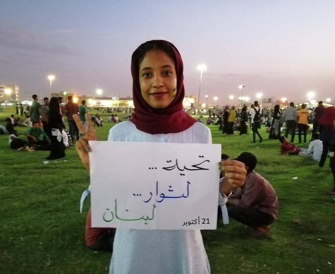 وانتشر على مواقع التواصل الاجتماعي صور “لكنداكة” السودان الشابة آلاء صالح وهي ترفع لافتة تحيي الثوار والثائرات في لبنان، ناهيك عن لافتات أخرى رفعت في شوارع السودان أيضاً، لتحيي الانتفاضة.
