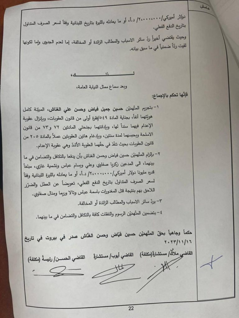 أصدرت محكمة جنايات بيروت حكمها بقضيةأنصار، بالإعدام لكل من حسين فياض وحسن الغناش.