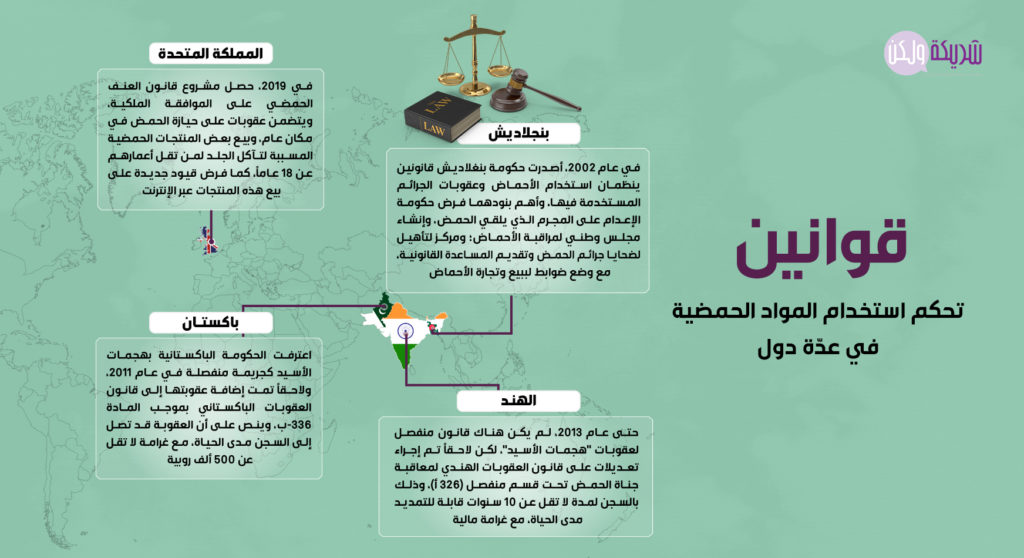 واللافت بحسب خديجة عبد الرحمن، هو غياب تعريف قانوني واضح للتعامل مع “جرائم الأسيد”، والاستعانة بنصوص تشريعية تخصّ حالات أخرى لمعاقبة الجناة. وضربت مثالاً على حالة لفتاة شوّه خطيبها السابق جزءاً كبيراً من جسدها، فتعاطف معها مسؤول النيابة. ثم وجه للجاني تهمة “الشروع في القتل”، ليحصل على عقوبة لا تقل عن عشر سنوات.