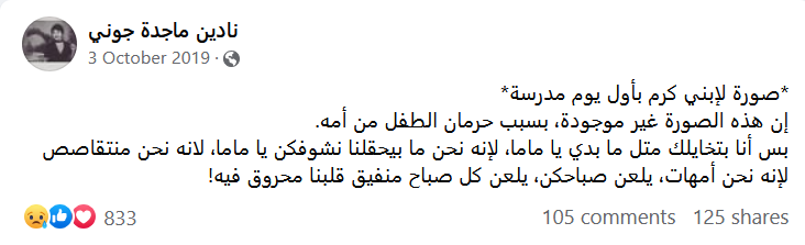 هذا ما نشرته المناضلة النسوية الراحلة نادين جوني بتاريخ 3 تشرين الأول/ أكتوبر 2019، مع بدء عامٍ دراسيٍّ آخر لها بعيدًا عن فلذة كبدها.