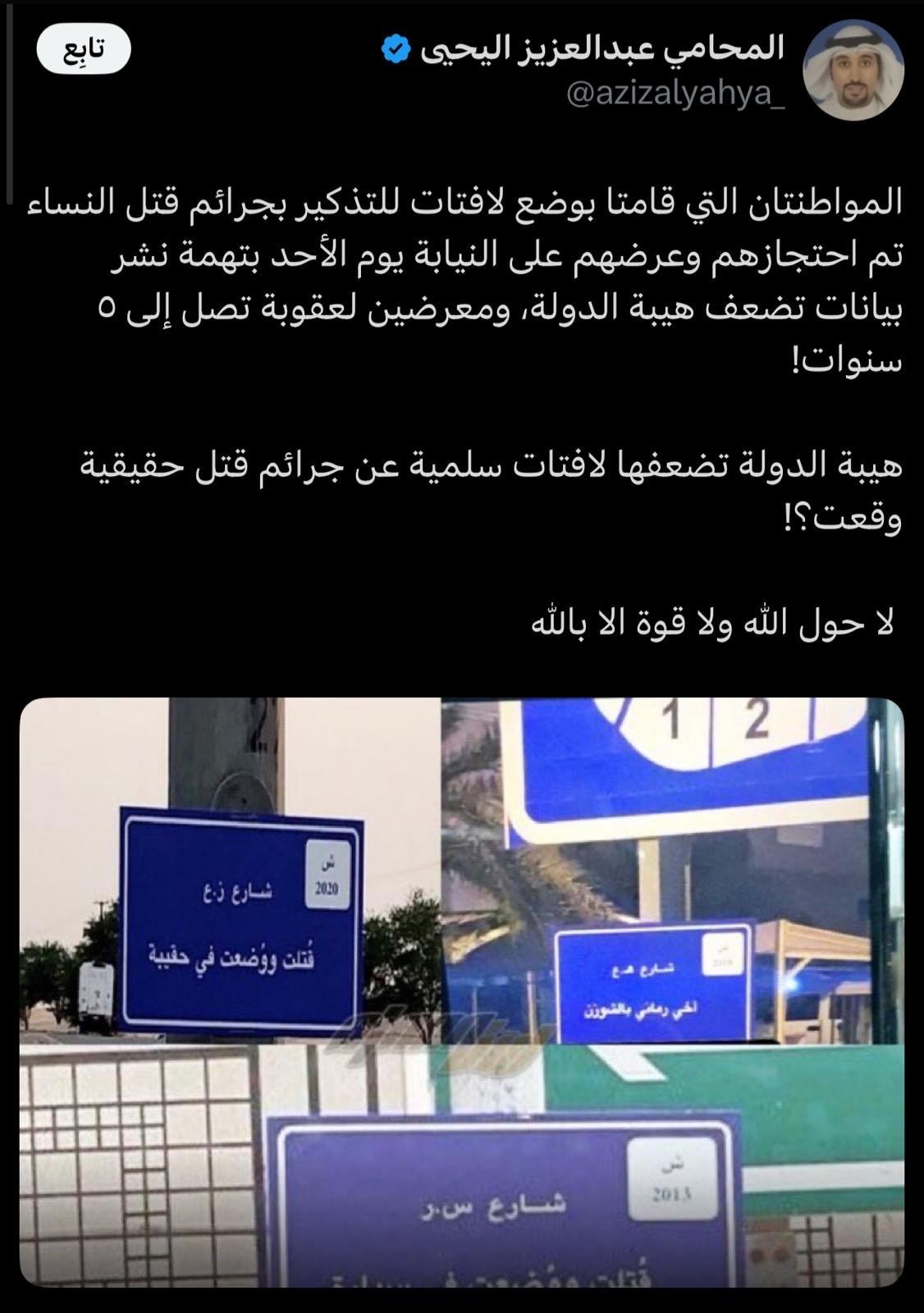 في 20 أيار/ مايو 2021، نشر المحامي عبد العزيز اليحيى عبر منصة “إكس” أن المواطنتين احتجزتا وعرضتا على النيابة العامة بتهمة “نشر بيانات تُضعف هيبة الدولة”، مع احتمال عقوبة تصل إلى خمس سنوات. ولم يرد أي خبر عن مصيرهن منذ ذلك الحين، مما يعكس استمرار سياسة التعتيم والإخفاء القسري، ويؤكد نمطًا ممنهجًا من التضييق على النشاط الحقوقي النسوي ومنع أي مساءلة.