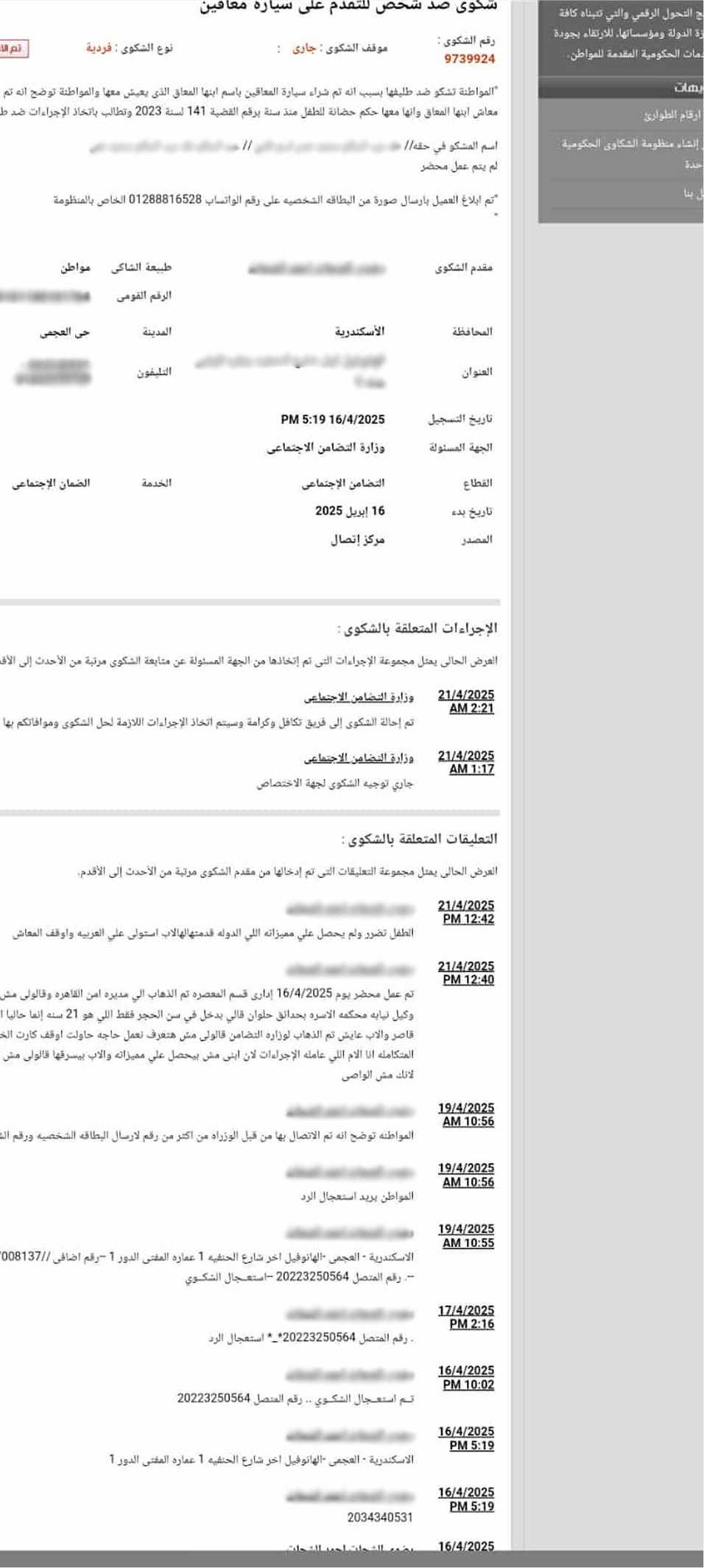 لكن الصدمة الكبرى جاءت في 15 نيسان/أبريل 2025، عندما اكتشفت توقف معاش كرامة الخاص بطفلها، تزامنًا مع توقف معاشها الشخصي، عقب صدور قانون الضمان الاجتماعي رقم 12 لسنة 2025. وبالاستعلام تبين أن الأب -الذي هجر ابنه منذ 14 عامًا- استغل وصايته القانونية وحصل على سيارة “المعاقين” الخاصة بالابن؛ ما أدى تلقائيًّا لإلغاء أحقيته في المعاش.